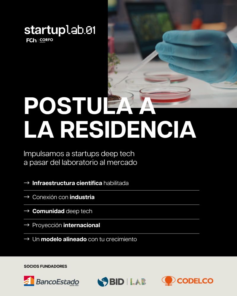 Startuplab.01 abre su convocatoria 2026 para startups de base científica (TRL 4–5) que necesitan infraestructura, conexiones y acompañamiento para dar ese salto. Impulsado por Fundación Chile, CORFO | Chilean Economic Development Agency y IDB Lab, este hub ofrece: Abierto a