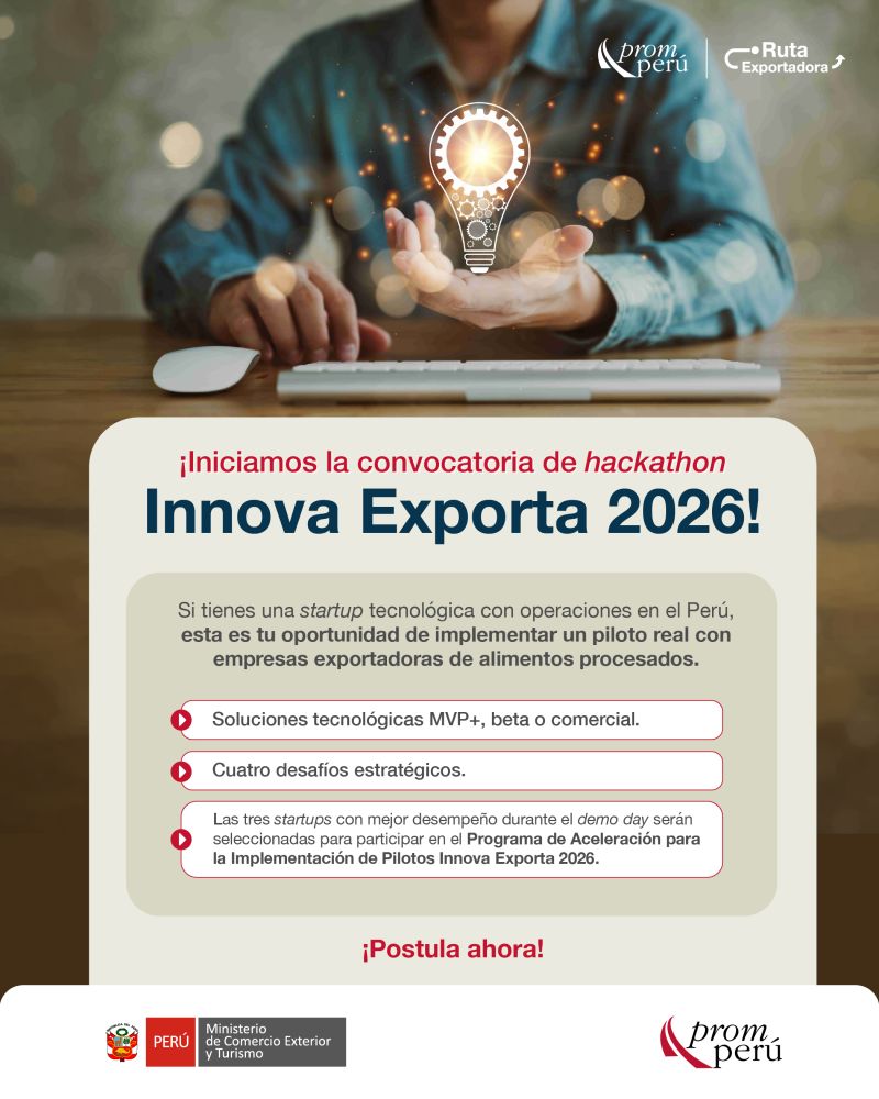 ¿Qué es Innova Exporta 2026? Somos una iniciativa de PROMPERÚ + SIPPO que busca transformar el sector exportador mediante innovación aplicada. A través de esta hackathon, startups con soluciones tecnológicas maduras podrán implementar pilotos reales con empresas exportadoras de alimentos