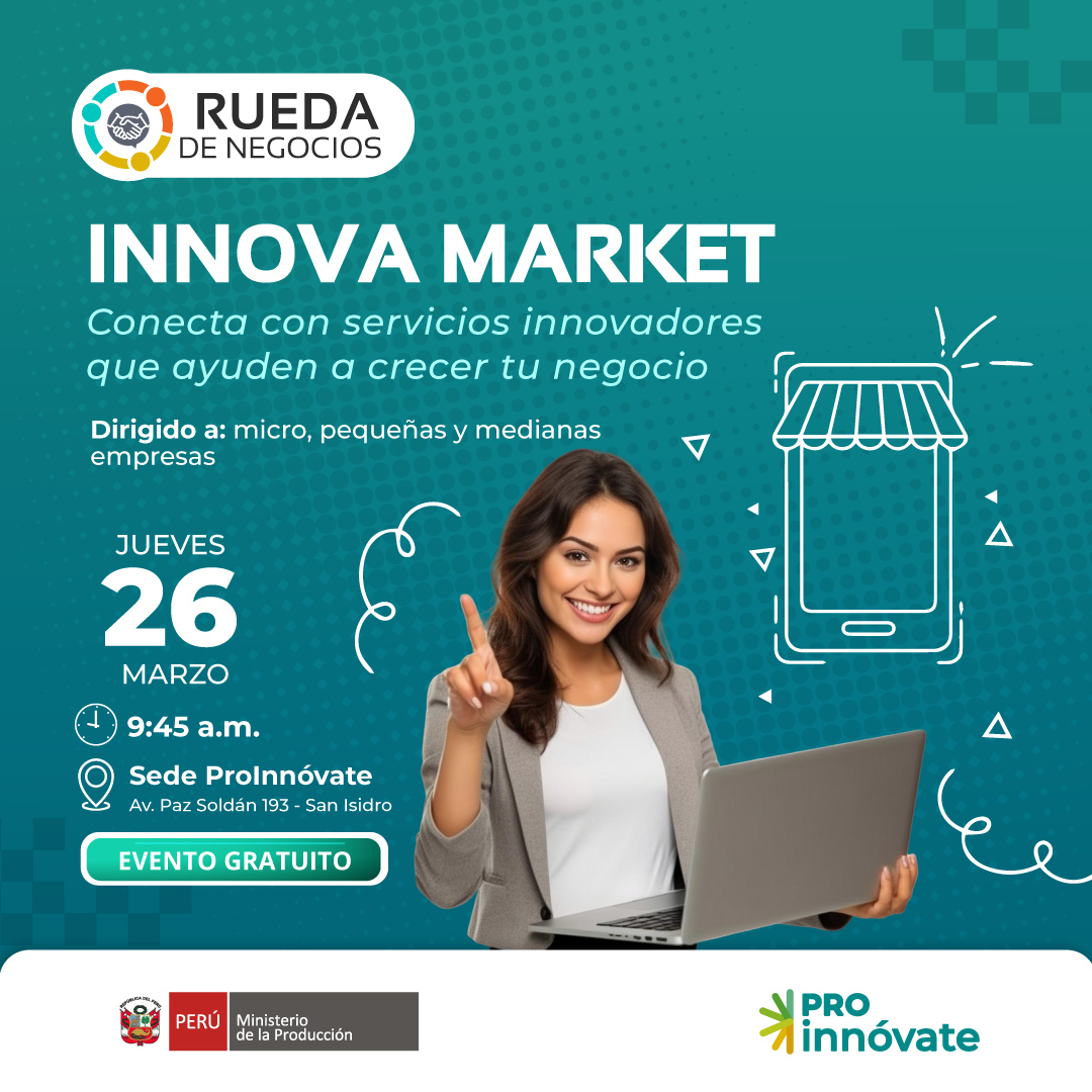 Ven al «Innova Market», la vitrina comercial de ProInnóvate para conocer y conectar con empresas que ofrecen servicios y tecnologías para elevar la productividad de las micro, pequeñas empresas y medianas empresas.