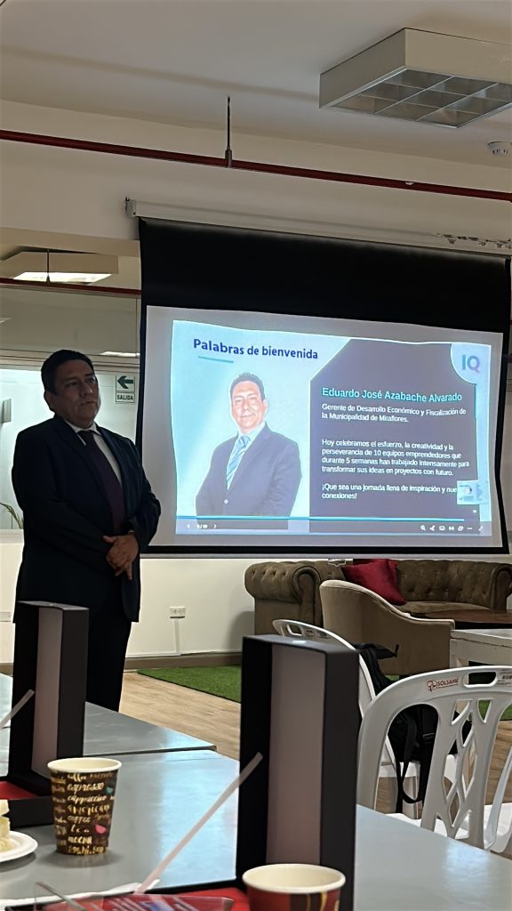 La jornada inició con las palabras de bienvenida de Lourdes Sánchez, directora de IQ Ventures, quien destacó la importancia de estos espacios para convertir ideas innovadoras en negocios sostenibles. Seguidamente, Eduardo José Azabache Alvarado, Gerente de Desarrollo Económico y Fiscalización de la Municipalidad de Miraflores, reafirmó el compromiso de la comuna en apoyar programas que fomenten la innovación y el emprendimiento en el distrito.